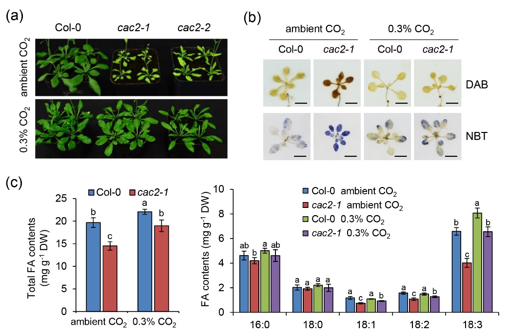 研究通过正向遗传学方法,筛选一个光呼吸表型突变体,即突变体在大气条件下生长矮小、叶片黄化,而在高浓度CO2条件(抑制Rubisco加氧反应)下恢复正常生长。通过图位克隆、全基因组重测序和遗传互补实验证明突变表型是由于CAC2基因突变造成的,该基因编码生物素羧化酶,是乙酰CoA羧化酶的亚基之一,参与叶绿体脂肪酸合成过程。研究发现,CAC2功能的完全缺失是胚致死表型;而点突变cac2突变体脂肪酸(尤其是C18:3脂肪酸)含量下降、叶绿体发育异常、光合作用效率下降,在高浓度CO2条件下这些形态缺陷和生理指标基本得到恢复。