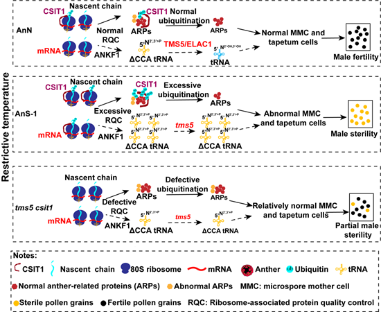 高温导致AnS-1中过度积累UbL40(含泛素)和蛋白质稳定性降低,可能引起蛋白质质量控制过程过度敏感,CSIT1异常泛素化降解CAT等这些花粉发育相关的蛋白,导致绒毡层和小孢子发育异常;同时,蛋白质量控制过程产生的2,3 -环磷酸化ΔCCA tRNA不能被功能缺失的TMS5加工成能够重新利用的tRNA,直接或者间接的影响花药发育。而在tms5 csit1突变体中,CSIT1的突变导致蛋白质质量控制系统失速,不能过度泛素化这些花粉相关的蛋白,也不能过度积累2,3 -环磷酸化ΔCCA tRNA,导致育性的部分恢复和不育起点温度的上升。(图2)