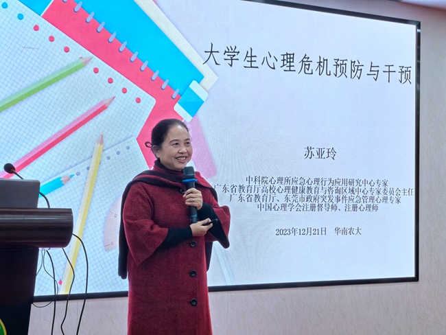 会议邀请了教育部辅导员培训与研修基地(华南师范大学)首席专家苏亚玲教授作题为《大学生心理危机的识别与干预》的辅导报告。苏系统讲授分析了“什么是心理危机”“如何识别心理危机”“怎样有效干预心理危机”,帮助与会老师从躯体症状、认知情绪、言语行为和社会功能等方面综合识别学生心理危机,她强调在干预过程中应遵循生命至上的原则,形成各部门工作合力,发挥联动效应,守护生命安全线。