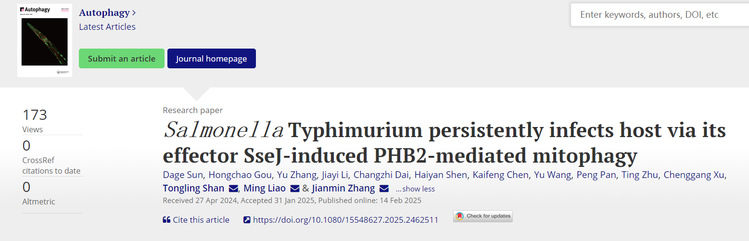 近日,兽医学院张建民教授课题组在中科院一区Top期刊Autophagy(影响因子14.6)在线发表题为“Salmonella Typhimurium persistently infects host via its effector SseJ-induced PHB2-mediated mitophagy”的研究论文,该项工作揭示了鼠伤寒沙门菌通过SseJ-PHB2-PINK1-PRKN途径利用宿主细胞的线粒体自噬实现胞内存活并造成持续感染的分子机制。
