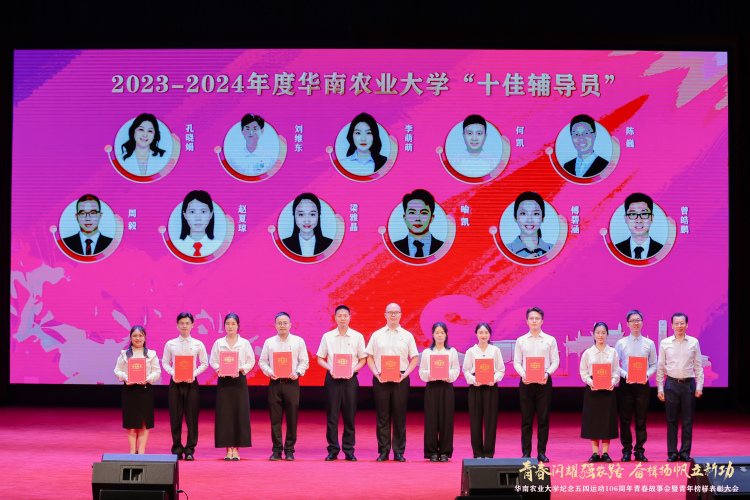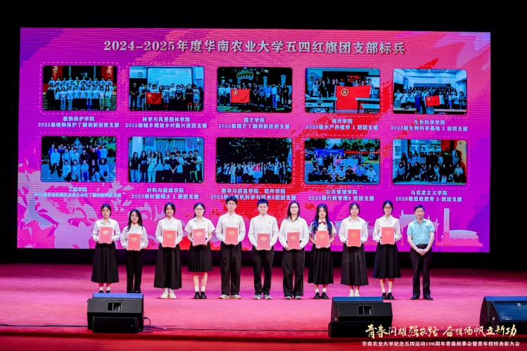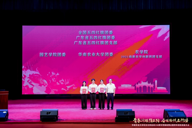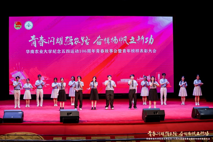 青春闪耀强农路,奋楫扬帆立新功。4月28日晚,学校在丁颖礼堂举行纪念五四运动106周年青春故事会暨青年榜样表彰大会,表彰过去一年表现突出的青年集体和个人,勉励华农青年积极向“身边榜样”学习,矢志强农兴农,争当时代先锋。校党委书记李凤亮,党委副书记丁红星、陈磊,副校长钟强,国家科技进步奖、全国五一劳动奖章获得者、动物科学学院教授吴珍芳出席大会。