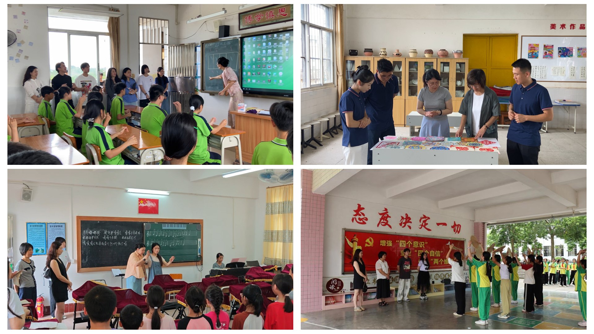 团队先后赴黎少中学、船步镇小学、罗平镇中心小学以及泗纶中学,开展了四场新颖别致的美育实践指导与课程教学活动。指导内容聚焦合唱技巧、合唱团排练、歌唱训练、校园舞蹈及课间操、美术与绘画等多个领域,形成了“精准滴灌”的教学模式。这些实践活动不仅提升了学生的艺术技能,更在他们心中种下了美的种子,激发了对艺术的热爱与追求。