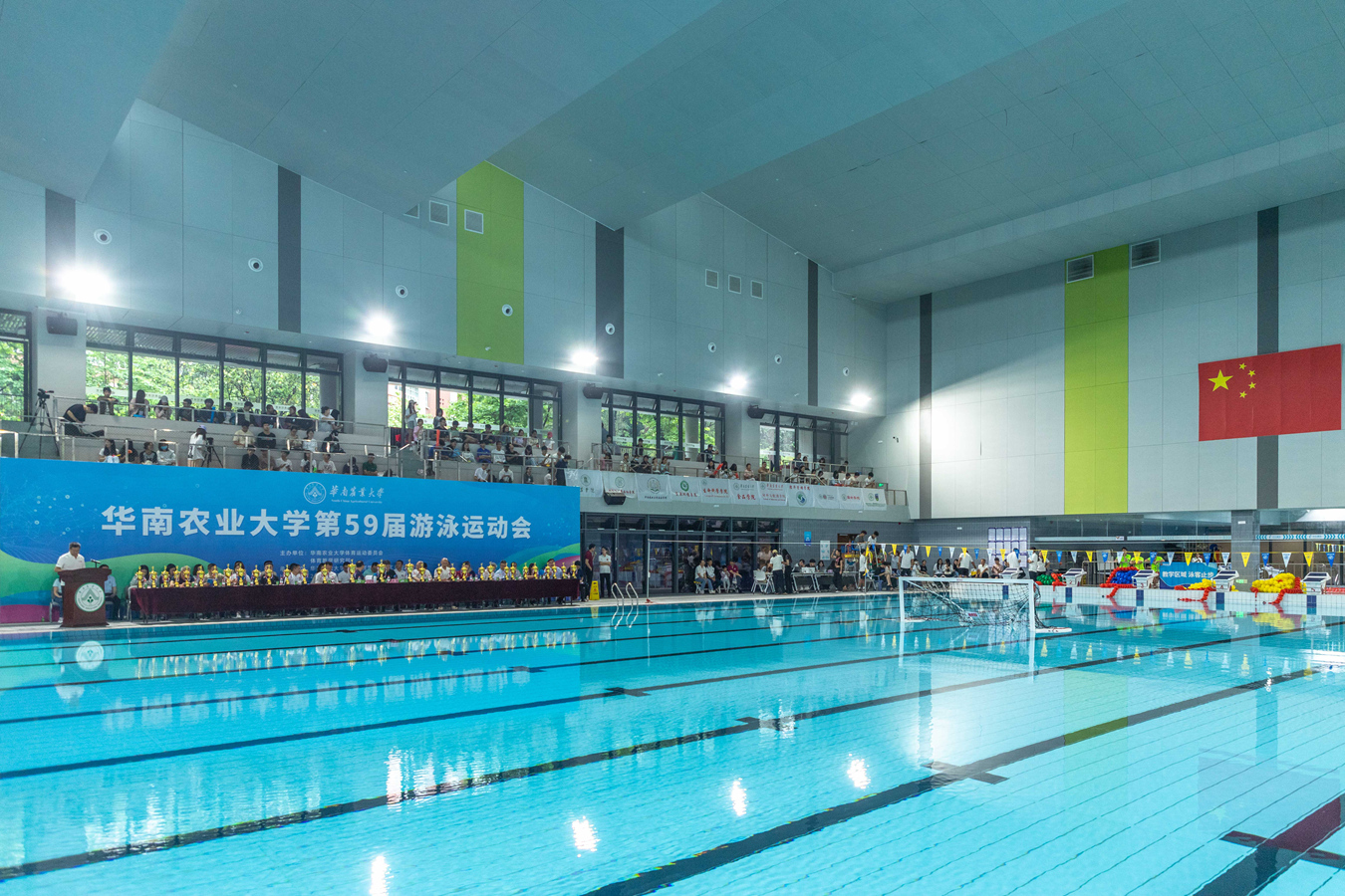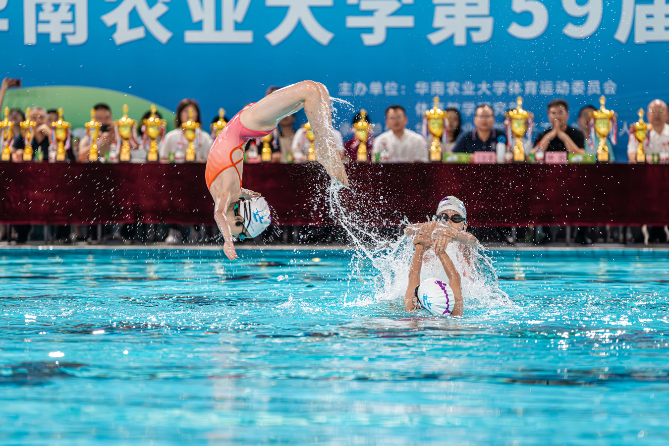 5月30日,华南农业大学第59届游泳运动会(以下简称“水运会”)首次在学校综合体育馆游泳馆内精彩开赛,近500名师生参赛。比赛为期一天,设置了自由泳、蛙泳、蝶泳、仰泳、混合泳接力、男女子混合自由泳接力等31个竞赛项目。今年还增加了教职工游泳项目,共有250多位老师参赛,其中师生混合泳项目,老师同学们同场竞技、携手接力。