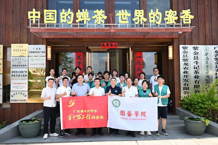 在紫金县九和镇,陈磊看望了正在当地开展“三下乡”实践的艺术学院“星火队”。据介绍,星火队是一支由本硕学生组成的跨专业队伍,正在开展暑期公益夏令营义教、乡村艺术墙绘与社交媒体推广活动。陈磊详细询问了同学们的生活与实践情况,勉励大家发挥专业特长,用艺术赋能乡村文化振兴,在实践中增长才干。在紫金客茶谷,陈磊慰问了园艺学院“点绿成金·紫金蝉茶双百行动服务队”。该队以茶学专业学生为主体,融合广播电视编导、动物科学等多学科背景学子,并吸引了紫金本地青年加入,通过直接对接茶企需求,开展直播带货、短视频运营等方式,推广“紫金蝉茶”区域品牌。陈磊鼓励同学们再接再厉,深入实践“紫金所需、华农所能”的双向奔赴,为“双百行动”贡献华农智慧与青春力量。
