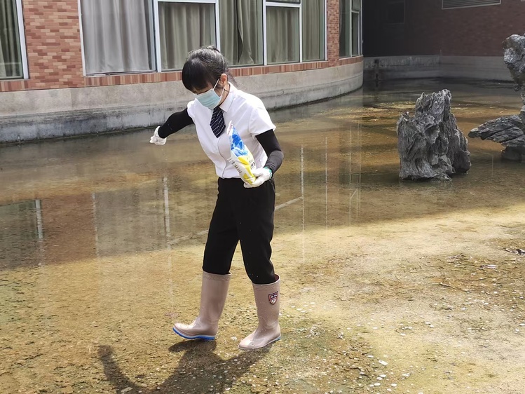 为从源头切断蚊媒传播链,学校聚焦“清积水、清垃圾、灭蚊虫”的核心目标,8月起每周开展全校环境卫生大扫除,重点对绿化绿篱、地下车库、排水系统、垃圾堆放点及宿舍、食堂周边等关键区域深度清理。其中总务部开展专项灭蚊行动,通过拉网式排查,全面清理花盆托盘、饮料罐等易积水容器,对无法清除的积水区域专人投放灭蚊药物,从源头遏制蚊虫滋生。