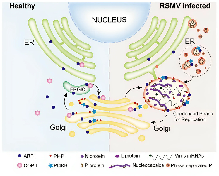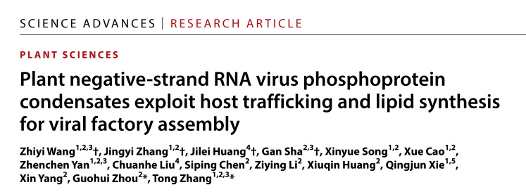 近日,我校广东省高等学校未来作物精准育种基础研究卓越中心、植物保护学院水稻病毒团队在Science Advances杂志发表了题为“Plant negative-strand RNA virus phosphoprotein condensates exploit host trafficking and lipid synthesis for viral factory assembly”的研究论文,揭示了水稻条纹花叶病毒(Rice stripe mosaic virus,RSMV)编码的P蛋白通过液-液相分离(Liquid-liquidphase separation,LLPS)形成生物分子凝聚体,作为病毒复制工厂(viral replication factories,VFs)的核心支架;P蛋白凝聚体通过劫持宿主囊泡运输通路间接招募磷脂酰肌醇4-激酶(PI4K),驱动磷脂酰肌醇-4-磷酸(PI4P)在病毒复制工厂内原位合成;PI4P又能促进P蛋白凝聚体的形成,从而扩大VFs并显著增强病毒复制效率。