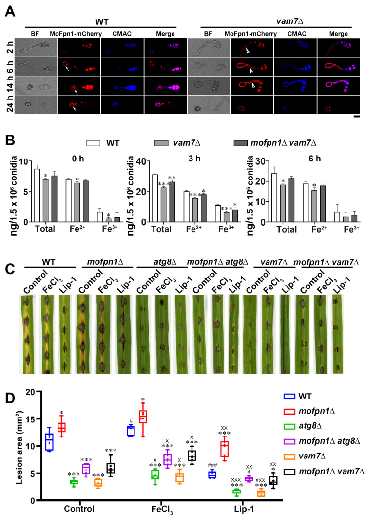 相似的,敲除负责自噬体-液泡融合的液泡SNARE蛋白Vam7(vam7∆突变体)也导致MoFpn1-mCherry无法正常转运至液泡腔,而是定位在液泡膜、多泡体(MVBs)膜或附着胞质膜上(图4A),导致胞内铁水平异常(图4B)。