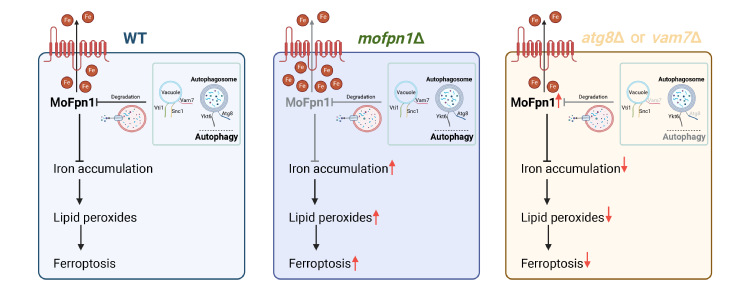 基于上述研究结果,作者提出自噬途径(包括自噬蛋白Atg8及SNARE蛋白Vam7)协同调控MoFpn1从膜结构向液泡的转运,通过降解铁外排蛋白MoFpn1而调控胞内铁离子水平从而促进发育过程中分生孢子铁死亡与稻瘟病菌致病性(图5)。