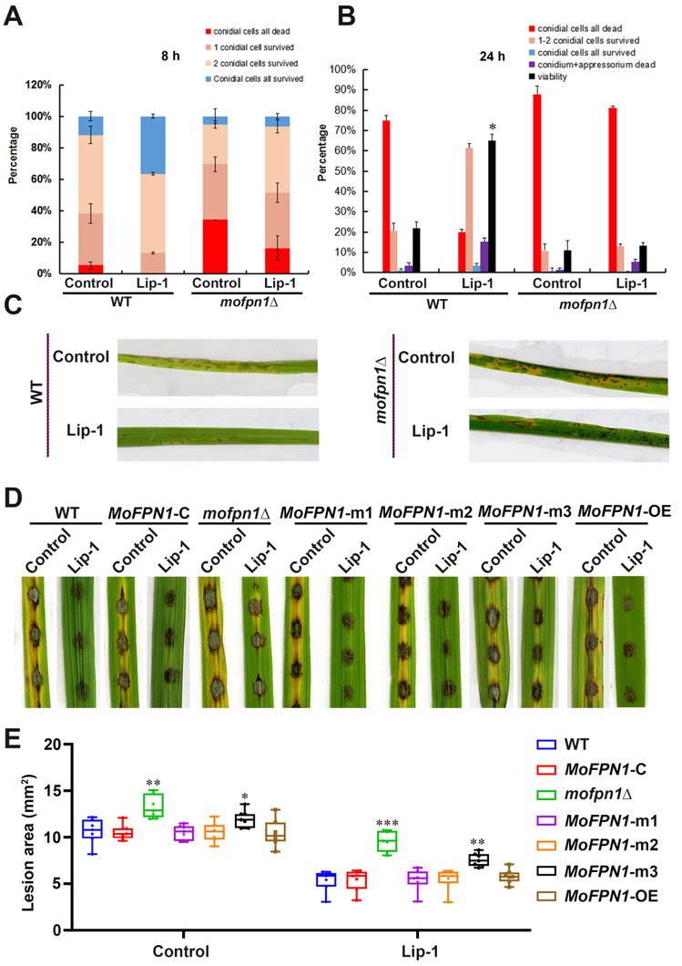 MoFpn1负调控稻瘟病菌铁死亡与致病性:mofpn1∆突变体表现为分生孢子死亡加速,致病性增强,且对铁死亡特异性抑制剂Lip-1的敏感性降低(图2A, B)。mofpn1∆突变体或关键氨基酸位点(S48和S226)突变均导致致病性增强(图2C-E)。这些结果证明,MoFpn1通过抑制发育中的分生孢子的铁死亡从而负调控稻瘟病菌的致病性。