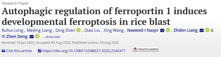 近日,华南农业大学邓懿祯教授团队联合新加坡淡马锡生命科学研究院Naweed I Naqvi教授团队在国际期刊Autophagy上发表了题为“Autophagic regulation of ferroportin 1 induces developmental ferroptosis in rice blast”的研究论文。该研究在稻瘟病菌中鉴定出铁外排蛋白MoFpn1,并揭示自噬通路通过降解MoFpn1来调控细胞内铁离子稳态,进而诱导分生孢子铁死亡发生,最终促进稻瘟病菌致病的新机制。
