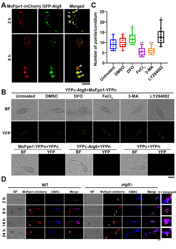 因此我们推测,atg8∆或vam7∆突变体由于无法及时转运与降解MoFpn1导致胞内铁离子持续外排、致使胞内铁离子浓度低而无法诱导发育过程必须的分生孢子铁死亡,从而引起致病性降低或丧失表型。通过外源添加Fe3+、或者在atg8∆或vam7∆背景敲除MoFPN1基因,均能部分恢复致病性(图4C, D)。