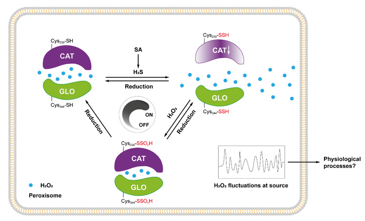 该研究发现,在水稻过氧化物酶体中可检测到硫化氢(H2S)的存在,且定位于过氧化物体的GLO与CAT均存在过硫化修饰,而SA能促进这种修饰。利用可视化工具材料等体内实验表明,H2S可在植株与细胞水平快速(<10 min)降低GLO-CAT相互作用;表面等离子共振(SPR)等实验证实H2S在体外同样可诱导GLO-CAT发生解离,表明H2S可作为GC开关的直接调控因子。蛋白关键位点研究发现:GLO蛋白Cys344位点的过硫化修饰调控GC开关,且不影响其酶活性;而CAT蛋白Cys230位点的过硫化修饰会抑制其自身活性,但不影响GC开关状态。此外,外源H2S能诱导过氧化物体的氧化态,且与乙醇酸(GLO底物)同时处理具有协同效应,表明H2S与SA类似,可在短时间内快速诱导光呼吸H2O2信号。研究还揭示了一个重要的反馈调节机制:GLO与CAT的过硫化促进光呼吸H2O2产生,而高水平H2O2又会反馈降低二者的过硫化水平,从而恢复GC开关状态和CAT活性,避免H2O2的持续积累。