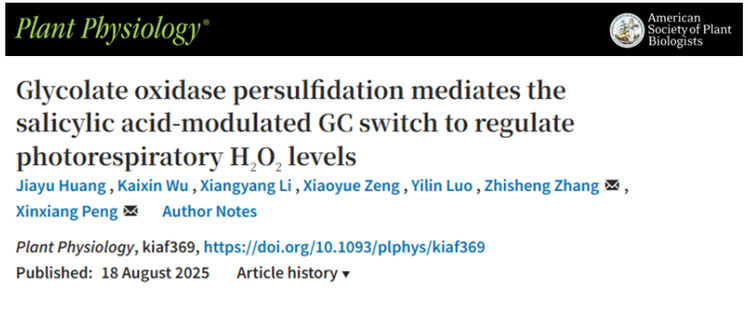 在Plant Physiology发表题为“Glycolate oxidase persulfidation mediates the salicylic acid-modulated GC switch to regulate photorespiratory H2O2 levels”的论文。团队前期发现乙醇酸氧化酶(GLO)与过氧化氢酶(CAT)的互作/解离(简称GC开关)调控光呼吸H2O2水平,此过程受到水杨酸(SA)调节,但内在分子机制并不清楚。