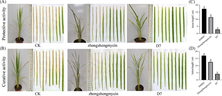 本研究首次系统评估了二硫醚类化合物对P. ananatis的体外抑菌活性。通过多路径合成策略,成功合成了41种二硫醚衍生物,并对其抑菌效能进行了系统性筛选。活性测试结果表明,化合物D7对该病原菌表现出显著抑制作用,其半最大效应浓度其EC50为0.87 μg/mL。化合物D7诱导P. ananatis的浓度依赖性细胞凋亡并提高细胞内ROS水平。此外,D7抑制细菌中SOD和CAT的活性,破坏氧化防御系统,引起ROS代谢紊乱。电子显微镜观察表明,D7会损害P. ananatis的细胞膜,导致膜塌陷和细胞质渗漏。化合物D7能有效防治P. ananatis引起的水稻细菌性叶枯病,具有显著的疗效和保护作用。此外,化合物D7在毒性测试中对非目标生物(蚯蚓和蚕)表现出低毒性。基于AquaticTox和BeeTox模型预测结果进一步表明,D7对水生生物(Oncorhynchus mykiss、Pimephales promelas、Daphnia magna、Pseudokirchneriella subcapitata)和蜜蜂均表现出低毒性。二硫醚化合物D7通过诱导氧化应激并协同破坏病原菌细胞膜的双重作用,对P. ananatis引起的水稻细菌性叶枯病表现出显著的防治效果。同时,毒性评估证实其对非靶标生物具有较低风险。