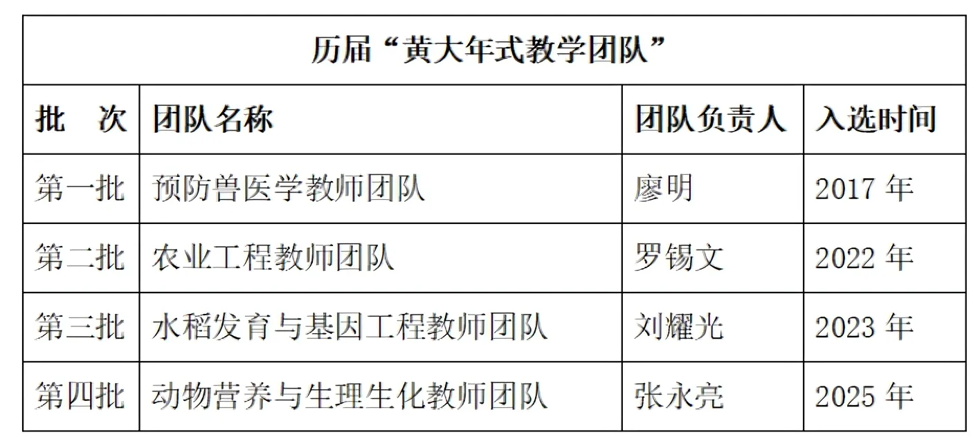水稻发育与基因工程教师团队、动物营养与生理生化教师团队分别入选“全国高校黄大年式教师团队”认定名单和入围名单,是学校在“双一流”建设征程中取得的又一标志性成果,为学校打造高素质、专业化、创新型教师队伍提供了坚实的支撑。未来,学校将持续推进黄大年先生的崇高精神与高校教师团队建设的深度融合,引导各教师团队以“全国高校黄大年式教师团队”为榜样,重点围绕思想政治与师德师风、教育教学、科研创新及社会服务等核心领域强化自身建设,全力提升教师团队的综合竞争力,为学校“双一流”建设注入更强动力,持续提升人才培养的质量与水平。