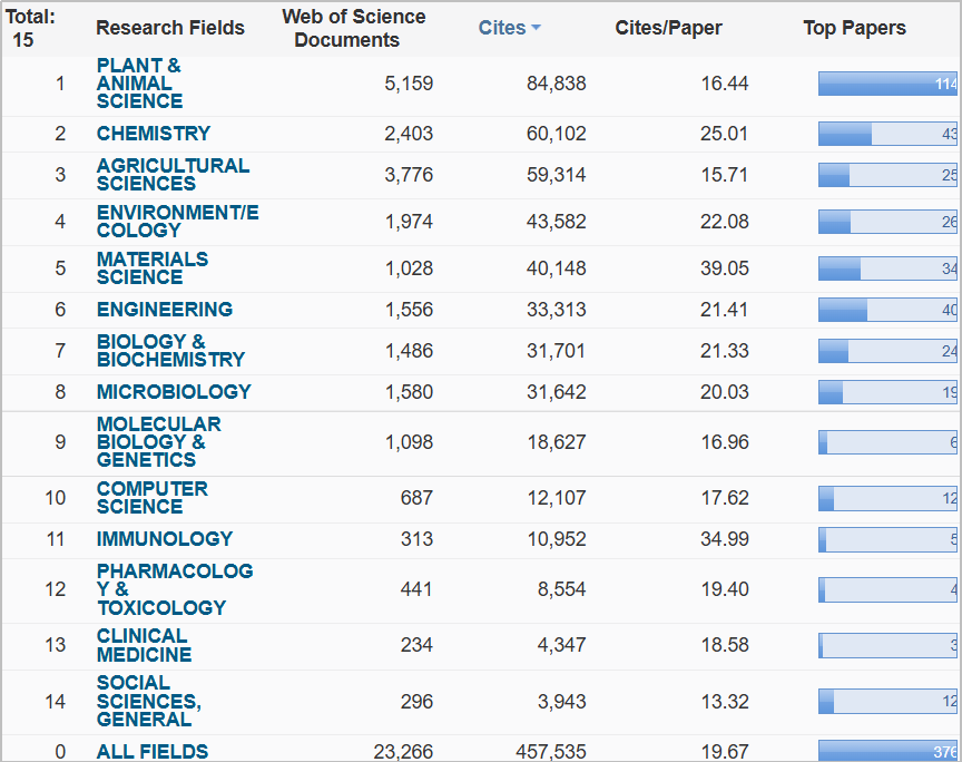 本期华农进入全球前1%的14个ESI学科如下:植物学与动物学、化学、农业科学、环境科学与生态学、材料科学、工程学、生物学与生物化学、微生物学、分子生物学与遗传学、计算机科学、免疫学、药理学与毒理学、临床医学、社会科学总论。