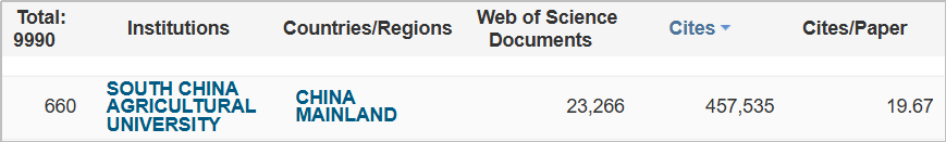 本期全球共9990家机构有ESI学科进入前1%,比上一期(9845家)增加145家。华农ESI学科共涉及23266篇论文(SCI、SSCI论文),被引总次数为457535次,篇均被引次数为19.67次,高水平论文数376篇。