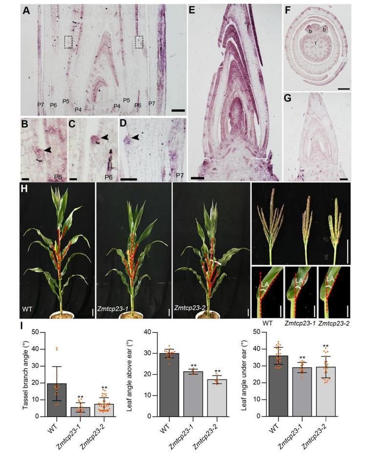 该项研究中,研究人员通过Y1H实验找到了一个在雄穗和叶中高度表达的可结合并调控LG1表达的TCP转录因子------ZmTCP23,通过CRISPR/Cas9基因编辑技术获得两个ZmTCP23功能缺失突变体,发现其植株表现出LA和TBA显著减小,且株高降低、雄穗分枝数减少等耐密株型优异性状(图1)。进一步研究发现ABA能够有效影响玉米LA和TBA大小,且LG1可以直接结合并抑制ZmXERICO1(编码ABA降解抑制因子)的转录表达,进而影响雄穗和叶中的ABA含量,最终调控玉米LA和TBA形成。此外,研究还发现ZmTCP23与TBA关键调控因子BAD1(TCP家族成员)能够形成正反馈调控,并形成蛋白复合物直接结合LG1启动子共同激活其表达,进而影响TBA大小。综上,该研究揭示了一个以LG1为核心的ZmTCP23-LG1-ZmXERICO1转录调控路径,该路径通过ZmTCP23转录因子调控LG1表达,影响下游ZmXERICO1转录,进而影响雄穗和叶中的ABA含量来协调LA和TBA的形成,为针对玉米LA和TBA的遗传改良提供了新的靶标,也为高密度耐受玉米品种的分子育种提供了新的方向和理论基础(图2)。