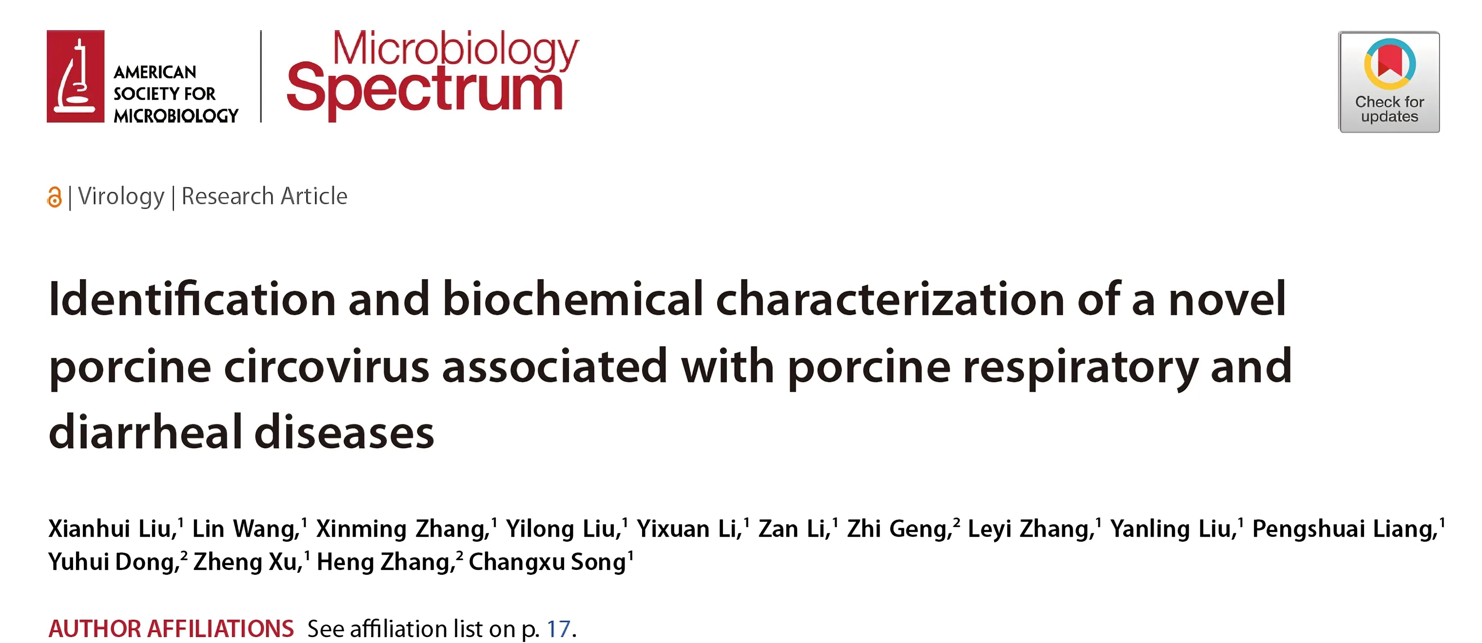 近日,动物科学学院/国家生猪种业工程技术研究中心宋长绪研究员课题组在美国微生物学术旗下刊物Microbiology Spectrum(中科院二区Top期刊)发表了题为“Identification and biochemical characterization of a novel porcine circovirus associated with porcine respiratory and diarrheal diseases”的研究论文。