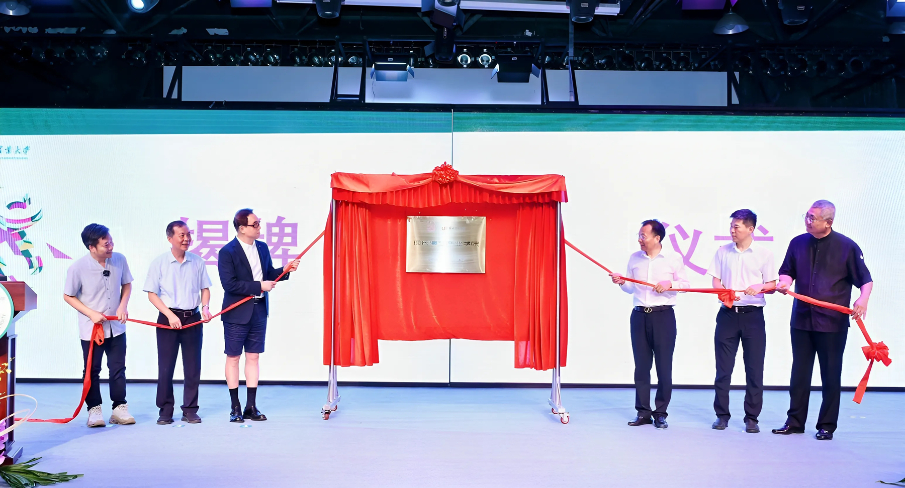 揭牌仪式现场,来自文化、艺术、教育等领域嘉宾共同见证学院成立。著名导演、博士、深圳大学教授,曾任中央广播电视总台文艺节目中心总负责人、党委书记,现任深圳大学中国文化国际传播研究院院长、第十五届全运会开幕式总导演郎昆;华南农业大学党委书记李凤亮;广东省志愿服务联合会会长、省委宣传部原副部长顾作义;广东省文学艺术界联合会党组成员、专职副主席生继锋;广东省文化和旅游厅原副巡视员王莉;华南农业大学党委常委、副校长杨运东;深圳卫视原执行总监、国家一级导演夏枫;第十五届全运会开幕式美术总设计尚天宝;广东振远文化集团董事长梁振运;教育部高等学校纺织类教学指导委员会服装表演专业分委员会副主任委员、东华大学服装与艺术设计学院表演系主任刘健芳;深圳合纵文化集团联合创始人、首席执行官许晓英;酷狗音乐党委副书记江明秦出席活动。