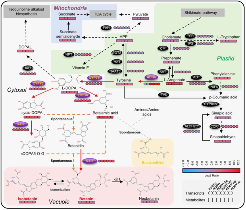 研究团队通过密码子优化合成了红甜菜(Beta vulgaris)中两个甜菜碱生物合成关键基因BvCYP76AD1和BvDODA1,以及来自紫茉莉(Mirabilis jalapa)的MjDOPA5GT,并将这3个基因通过P2A肽介导的多顺反子策略进行串联,获得了基础的RUBY系统。烟草瞬时转化实验表明,在RUBY基础上进一步引入反馈不敏感的酪氨酸:分支酸脱氢酶基因BvADHα增强了上游底物的通量,显著促进了甜菜红素的合成。为了获得胚乳富含甜菜红素的水稻种质,研究团队进一步采用3种策略将BvADHα与RUBY表达盒进行连接并导入水稻:(1)由独立的胚乳特异表达启动子PGluB4和PGluB1分别驱动RUBY和BvADHα表达(RUBY+A);(2)将BvADHα通过F2A肽(与RUBY中的P2A肽不同)序列融合到RUBY末端(RUBYFA),并由单个PGluB4启动子驱动;(3)将BvADHα通过P2A肽(与RUBY中的P2A肽相同)序列融合到RUBY末端(RUBYPA),并由单个PGluB4启动子驱动。结果表明,BvADHα和RUBY的共表达使增强型eRUBY rice胚乳中甜菜红素平均含量高达22.06 mg/100 g干重,比基础的RUBY水稻高出1.75至5.26倍。其中RUBY+A株系甜菜红素含量最高(30.84 mg/100 g干重),表现为RUBY+A>RUBYFA>RUBYPA>RUBY株系。这使得eRUBY rice胚乳的抗氧化活性相比野生型提高了1.36至6.44倍。最后,研究团队通过多组学联合分析,阐明了生物合成过程中代谢途径和源库关系之间的相互作用和重要性(图2)。本研究开发的增强型eRUBY报告系统可作为可视化标记元件用于基础研究和遗传转化筛选,也为多顺反子转基因表达和功能性粮食作物的研发提供了指导策略。