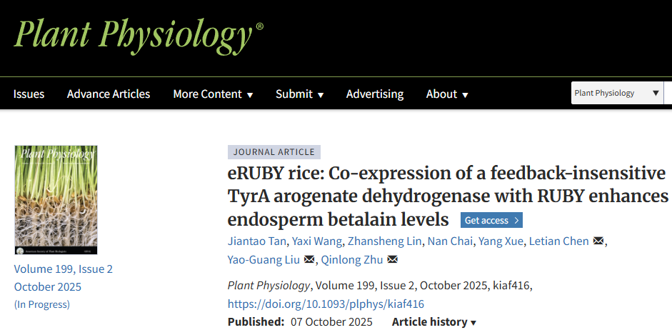 近日,农学院、广东省高等学校未来作物精准育种基础研究卓越中心、岭南现代农业科学与技术广东省实验室和亚热带农业生物资源保护与利用国家重点实验室刘耀光/祝钦泷/陈乐天团队与广东省农科院水稻所谭健韬副研究员在植物学著名期刊Plant Physiology在线发表了题为“eRUBY rice: Co-expression of a feedback-insensitive TyrA arogenate dehydrogenase with RUBY enhances endosperm betalain levels”的研究论文,利用“推—拉”的合成代谢工程策略开发出增强型的eRUBY(enhanced RUBY)报告系统,在烟草和水稻中验证其有效性和稳定性。通过多基因代谢工程技术培育出胚乳富含甜菜红素的水稻种质“红宝石米”(eRUBY rice),并评估了不同遗传元件组合在多顺反子基因表达中的效率,为基于RUBY系统的应用研究提供了新的强力元件工具,对推动作物绿色生物智造和提高粮食营养价值具有重要战略意义。