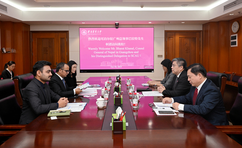 10月30日,尼泊尔驻广州领事馆总领事巴拉特·卡纳尔率团访问华南农业大学。校长薛红卫会见了代表团一行,双方就推动中尼农业教育与科技合作交换意见。