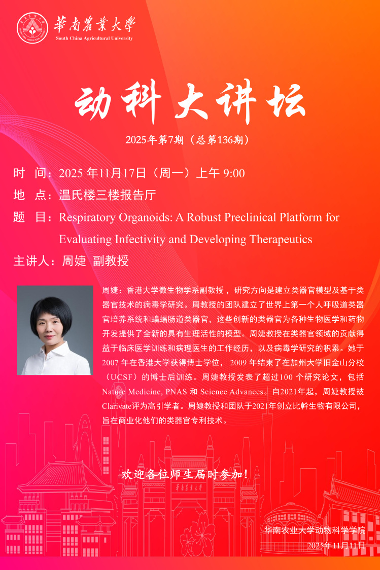 动科大讲坛(第136期):Respiratory Organoids: A Robust Preclinical Platform for Evaluating Infectivity and Developing Therapeutics