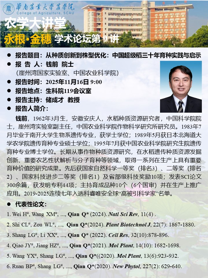 农学大讲堂--“永根•金穗”学术论坛第9讲 — — 从种质创新到株型优化:中国超级稻三十年育种实践与启示