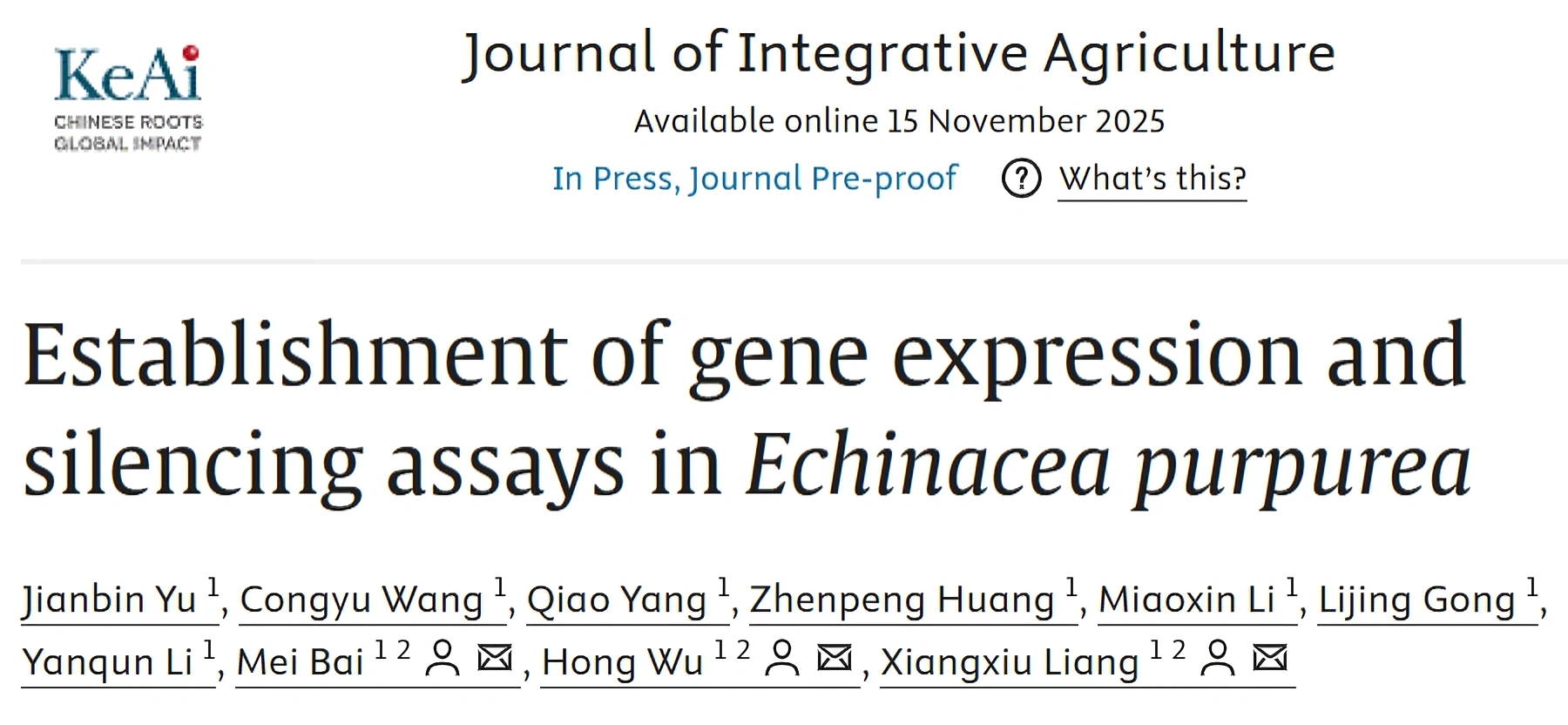 近日,生命科学学院药用植物研究中心在农业科学领域国际知名期刊Journal of Integrative Agriculture(中科院一区)发表体题为“Establishment of gene expression and silencing systems in Echinacea purpurea”的研究论文,首次系统构建了药用植物紫锥菊(Echinacea purpurea)的多套基因表达与沉默平台的基因功能研究体系,为该物种的功能基因解析、代谢调控研究及分子改良育种提供了关键实验体系,对推动菊科药用植物的分子生物学研究具有重要意义。