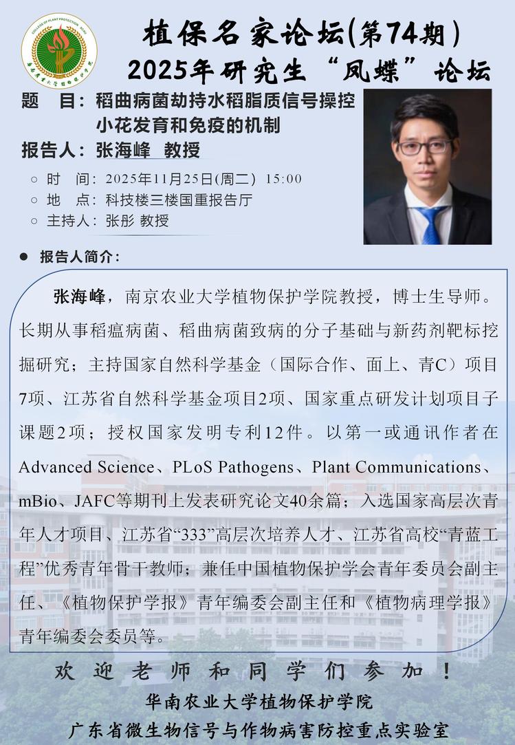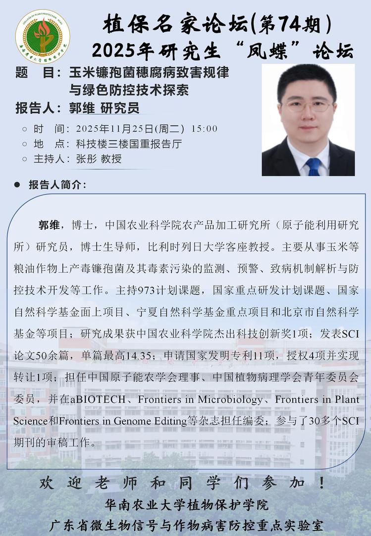 植保名家论坛(第74期):玉米镰孢菌穗腐病致害规律与绿色防控技术探索、稻曲病菌劫持水稻脂质信号操控小花发育和免疫的机制、稻瘟病菌-水稻-环境互作机制