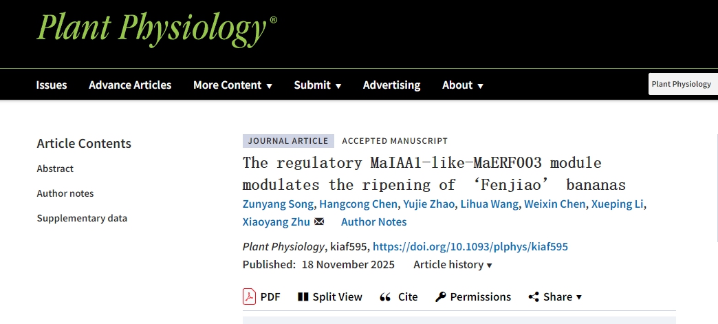 近日,园艺学院采后生物学团队在植物学经典期刊Plant Physiology(中科院一区Top期刊,IF5: 7.7)在线发表了题为“The regulatory MaIAA1-like-MaERF003 module modulates the ripening of ‘Fenjiao’ bananas”的研究论文。该研究揭示了一个MaIAA1-like-MaERF003调控模块,介导生长素-乙烯信号交互调控“粉蕉”果实成熟。该研究为粉蕉果实贮藏保鲜提供了新的理论依据。