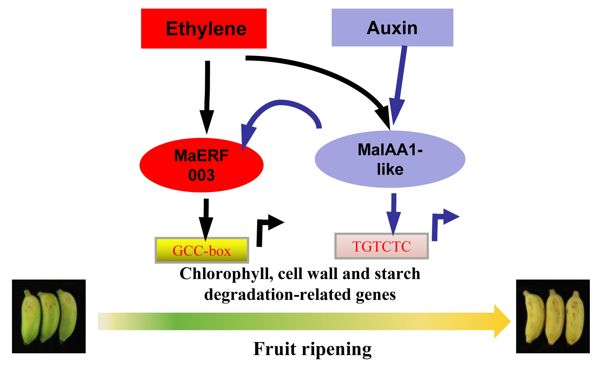 团队前期的研究发现,1-甲基环丙烯(1-MCP)能够有效延缓粉蕉果实成熟,但是不适当的1-MCP处理会导致果实滞绿的青皮熟现象。转录组分析发现乙烯信号和生长素信号都极显著的受到1-MCP影响。在本研究中,研究团队发现乙烯和生长素均能促进成熟及生长素和乙烯信号关键调控因子MaIAA1-like和MaERF003的表达;而1-MCP处理则抑制成熟及这两个基因的表达。MaIAA1-like和MaERF003可激活与叶绿素降解(MaNOL、MaPPH、MaSGR1)、淀粉降解(MaBAM3、MaBAM6、MaBAM7、MaPWD1、MaAMY3)以及细胞壁降解(MaPL8、MaSUR14)相关基因的表达。瞬时过表达MaIAA1-like和MaERF003,可通过加速果实软化与褪绿,并诱导叶绿素、淀粉及细胞壁降解相关基因的表达,从而促进成熟;而瞬时沉默这两个基因则延缓果实软化与褪绿。