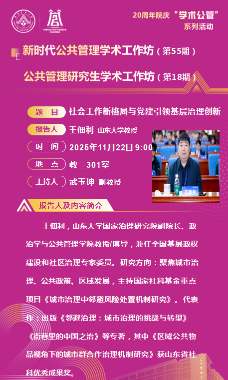 公共管理学院20周年院庆“学术公管”系列活动暨新时代公共管理学术工作坊(第55期)、公共管理研究生学术工作坊(第18期):社会工作新格局与党建引领基层治理创新