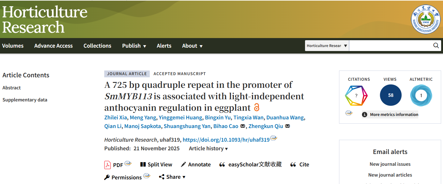 11月21日,园艺学院曹必好教授、邱正坤副研究员团队在园艺学领域国际著名学术期刊Horticulture Research上在线发表了题为“A 725 bp quadruple repeat in the promoter of SmMYB113 is associated with light-independent anthocyanin regulation in eggplant”的研究论文。文章揭示了茄子非光敏性(NPS)果实着色的分子机制,为茄子果实颜色定向育种提供了关键基因靶点和分子标记。