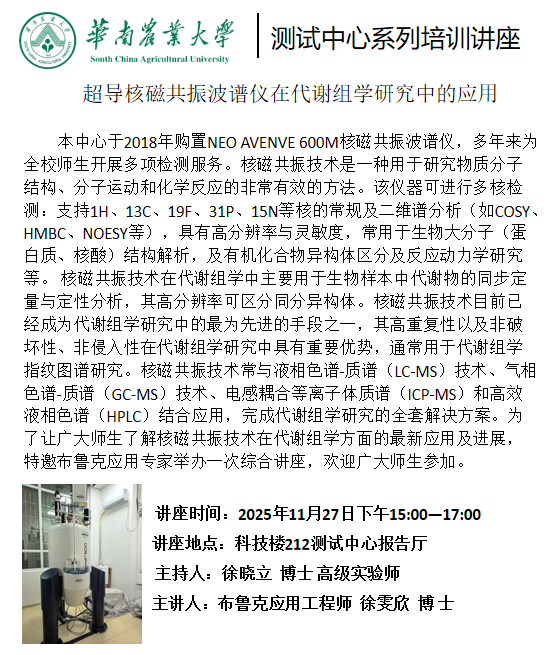 测试中心系列培训讲座(2025年第15期):超导核磁共振波谱仪在代谢组学研究中的应用