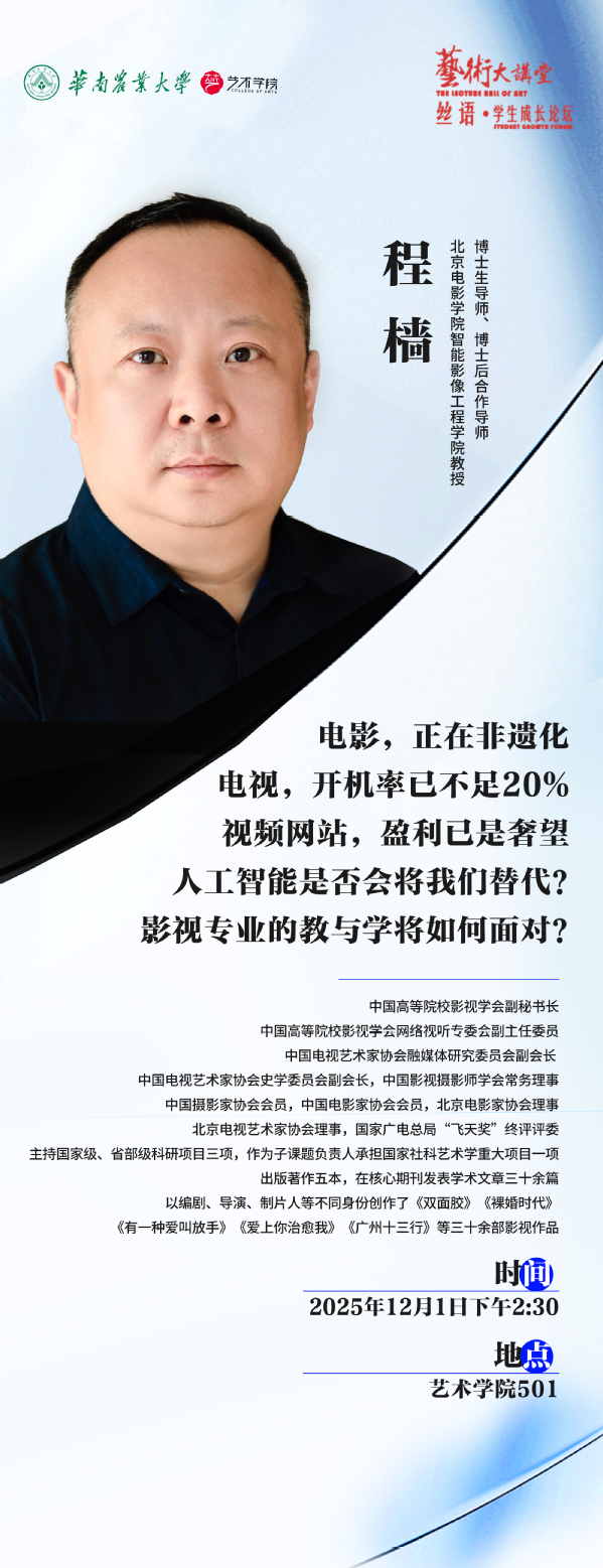 “艺术大讲坛:丝语·学生成长论坛”第19期——《电影,正在非遗化电视,开机率已不足20%视频网站,盈利已是奢望人工智能是否会将我们替代?影视专业的教与学将如何面对?》