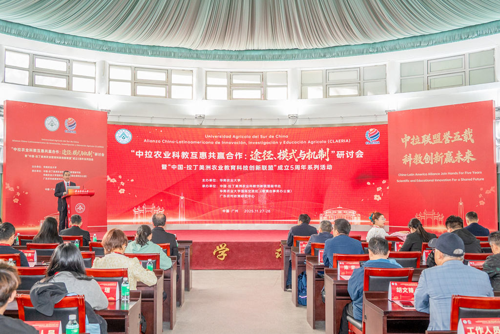 11月28日,在“中国-拉丁美洲农业科教创新联盟”(以下简称“中拉联盟”)成立五周年之际,华南农业大学在红满堂举办“中拉农业科教互惠共赢合作:途径、模式与机制”研讨会。来自中国农业科学院、中央民族大学、扬州大学、福建农林大学、广东海洋大学、仲恺农业工程技术学院、东莞理工学院、韶关学院及温氏集团、联鲲集团等联盟成员代表共聚一堂,围绕中拉农业科教合作展开深入交流。学校副校长陈乐天、中国农业科学院国家合作局副局长刘文德、哥伦比亚工程技术大学中国事务部主任Hugo Geovanny Hilarion出席研讨会。