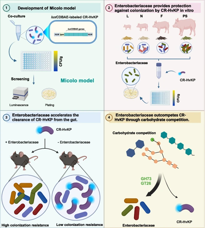 碳青霉烯类耐药高毒力肺炎克雷伯菌(CR-HvKP)兼具高耐药性与高致病性,被视为“超级细菌”,常引起难以治愈的致命感染,已成为临床和公共卫生领域的重大威胁。该菌的肠道定植是引发后续感染的关键环节,不仅在医院内传播,也在环境和食品中逐渐被检出。值得注意的是,猪群中CR-HvKP的携带率明显低于其他宿主,其背后机制此前尚不明确。研究团队聚焦于肠道微生物介导的定植抗性,建立了一种名为“Micolo”的体外定植评估模型,利用生物发光技术实时监测病原菌生长,并比较了哺乳仔猪、保育猪、育肥猪及怀孕母猪肠道菌群对CR-HvKP的抑制能力。结果发现,怀孕母猪的肠道菌群表现出最强的保护作用,能显著降低病原菌量。通过热灭活实验、16S rRNA基因测序及单菌水平验证,团队从妊娠母猪体内分离出一株ST290型肺炎克雷伯菌(GX2-22),该菌在体外和体内实验中对多种CR-HvKP定植具有较强的拮抗作用。进一步的基因组与代谢分析显示,GX2-22等保护菌株携带57-62个碳水化合物活性酶,可通过竞争碳水化合物(尤其是蔗糖)抑制CR-HvKP生长。肠道生态位特异性补充剂丙酮酸甲酯可部分缓解这种生态抑制作用。该研究阐释了肠道菌群提供“定植抗性”的机制,并提出以“以菌制菌”的微生态调控策略,为阻断CR-HvKP肠道定植提供了非抗生素干预新思路。