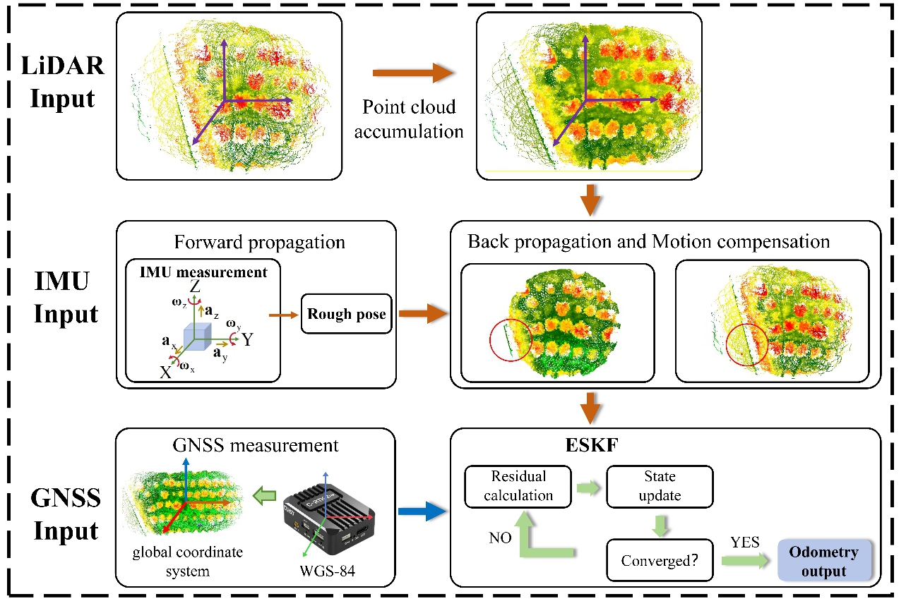 在实验流程上,研究首先利用搭载了激光雷达、高精度全球导航卫星系统等多种传感器的无人机平台,对丘陵山地非结构化果园开展多架次航测作业,获取高密度的原始三维点云。随后,为解决无人机在复杂地形飞行中易产生的地图垂直漂移问题,系统采用了一种多传感器紧耦合的建图方法,将高精度卫星定位信息与惯性导航及 LiDAR 里程计进行深度融合,对飞行姿态与轨迹进行持续约束与校正,从而构建出精度高、连续性好、在空间上全局一致的三维点云地图。
