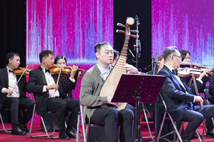 琴起如潮,乐涌成风,《红旗颂》的旋律响起,拉开新年音乐会的序幕。本场音乐会以“初心”为魂,以“雅韵”为骨,既有《红色娘子军》《不忘初心》的红色精神传承,也有《西关小姐》《彩云追月》中的岭南意韵,还有《第二圆舞曲》《雷电波尔卡》等西洋经典演绎,并特别带来《春节序曲》,平添新年暖意,跨域古今、融通中外。演出最后,校领导、高层次人才教师代表与艺术学院教师联袂献唱《歌唱祖国》,表达对祖国的真挚情感,激昂澎湃的旋律凝聚奋进力量,将整场音乐会推向高潮。