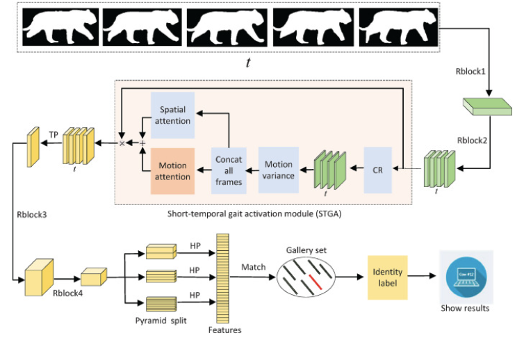动物身份识别技术是开展动物管理与动物生态学研究的重要基础。现有动物身份识别方法多为侵入式,这类方法不仅会干扰动物的日常活动,还可能导致动物产生疼痛、出血及感染疾病等风险,对野生动物而言,此类风险尤为突出。步态是一种独特的生物特征,可在无需动物主动配合的前提下实现远距离身份识别,且步态特征一旦形成便难以伪装。当前,步态识别的研究重心集中于人类领域,针对动物步态识别的相关研究则十分有限。本研究构建了两个动物步态数据集,并通过研究发现:动物步态的周期普遍短于人类步态。基于这一发现,我们提出了一种名为动物步态识别网络(AnimalGaitNet)的框架,该框架利用步态特征实现动物身份识别。同时,我们设计了一种即插即用的短时步态激活模块(STGA),用于放大动物步态的波动特征。实验结果表明,本文提出的动物步态识别方法对家畜的识别准确率超过90%,证实了利用步态特征进行动物身份识别的可行性。这项研究成果也为动物保护工作提供了参考价值,尤其适用于野生动物保护与野生生物资源保育领域。