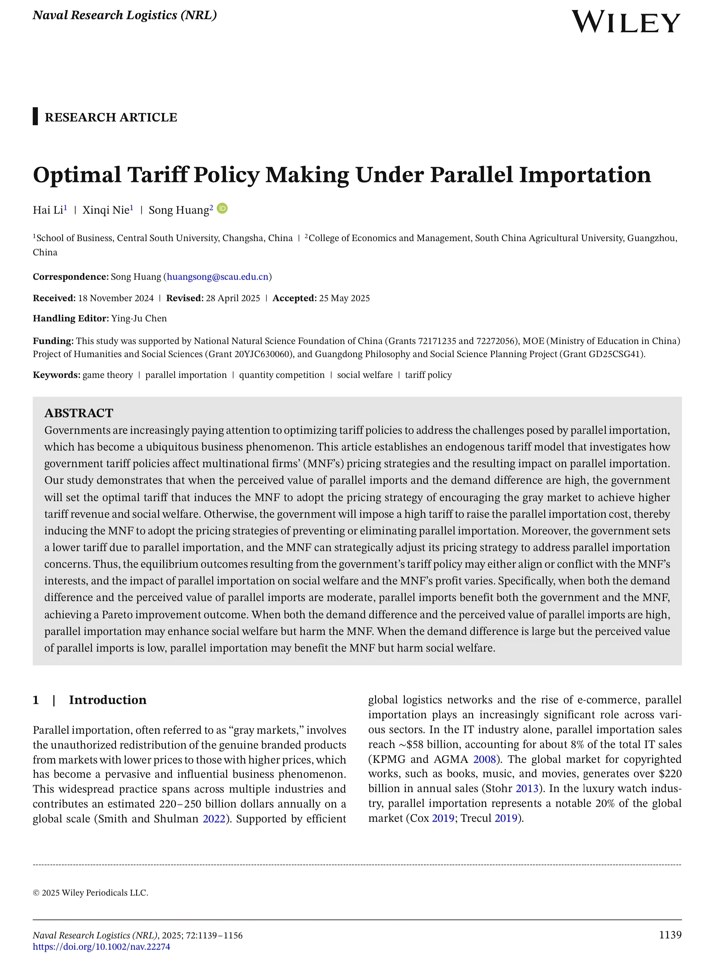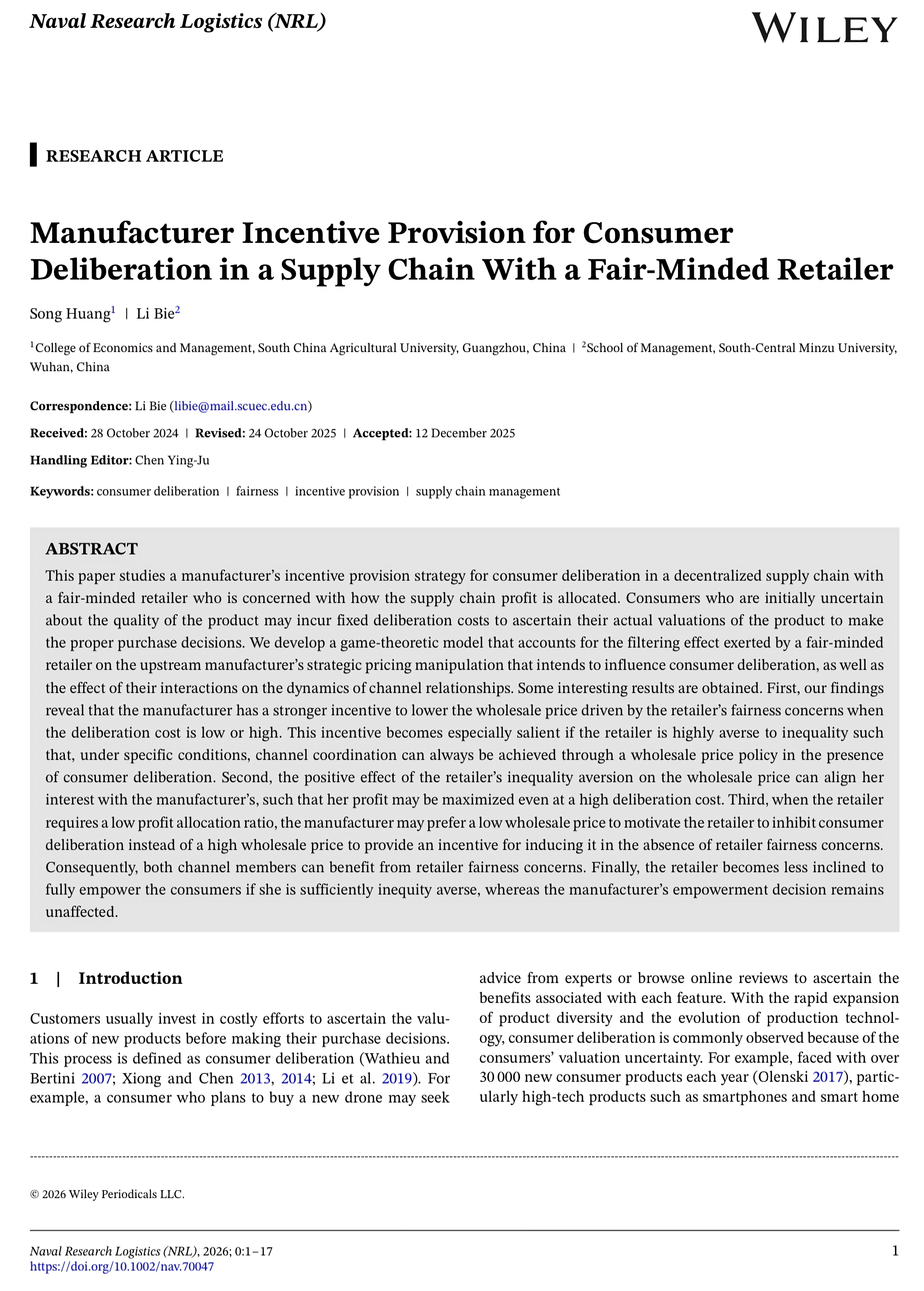 近日,经济管理学院黄松教授在管理科学与运筹学领域国际著名期刊Naval Research Logistics在线发表题为“Manufacturer incentive provision for consumer deliberation in a supply chain with a fair-minded retailer”“Optimal tariff policy making under parallel importation”的两篇研究论文。
