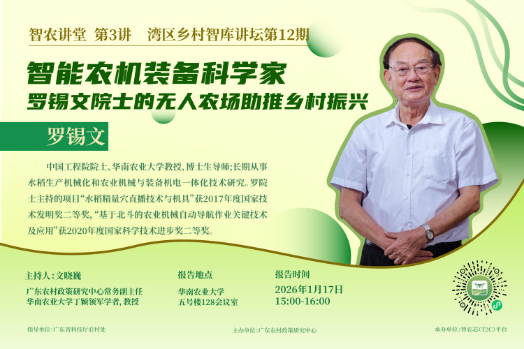 【预告】智农讲堂 第3讲 湾区乡村智库讲坛第12期:智能农机装备科学家罗锡文院士的无人农场助推乡村振兴
