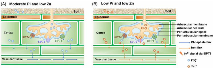 课题组以番茄(Solanum lycopersicumcv. Micro-Tom)为材料,接种菌根真菌异形根孢囊霉(Rhizophagus irregularis),系统分析了在单一以及复合磷、锌、铁缺乏条件下宿主植物的生理与分子响应。结果表明SlPT3是丛枝菌根诱导的磷转运基因,在磷与锌同时缺乏时表达显著上调,其定位于环丛枝膜,直接参与菌根途径的磷吸收。在缺锌条件下,敲降SlPT3会导致磷吸收减少、丛枝发育受阻,说明SlPT3参与锌缺乏下的磷稳态与丛枝发育。在磷与锌双重缺乏条件下,SlPT3参与铁(Fe2+)的吸收与积累,影响菌根植物(番茄)中的铁含量。在酵母系统中异源表达SlPT3基因,不仅能恢复磷转运缺陷,还能在铁吸收缺陷型酵母菌株中恢复其生长,表明SlPT3可能整合低磷低锌信号调控丛枝菌根中的铁(Fe2+)营养平衡。