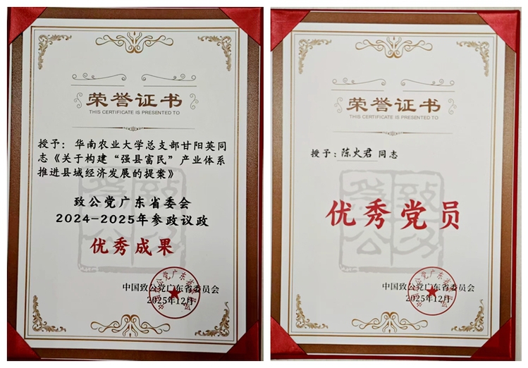 近日,致公党广东省委会公布2024-2025年度表彰名单,致公党华南农业大学总支部荣获“参政议政工作优秀组织”称号,其集体成果《关于构建“强县富民”产业体系推进县域经济发展的提案》被评为参政议政优秀成果,总支党员陈火君荣获“优秀党员”称号,实现组织与个人荣誉双丰收。