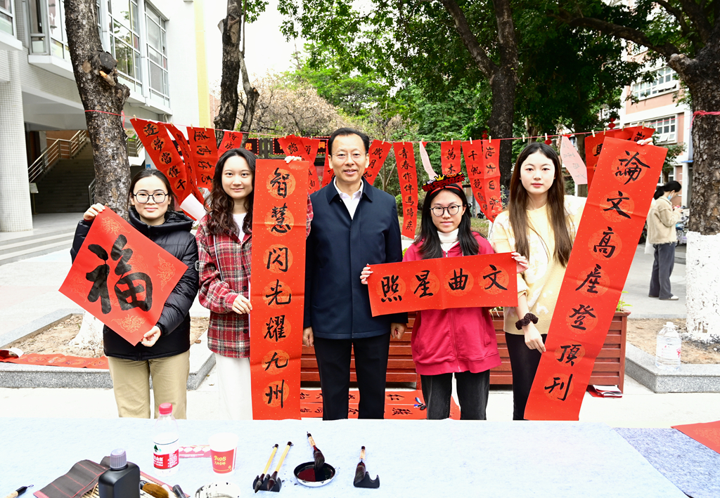 为了丰富留校学生的文化生活,学校还组织开展了迎春庙会游园活动,留校学生们踊跃参与体验写春联,剪窗花,猜灯谜,制作漆扇、糖画和棉花糖等传统民俗活动。游园会现场,李凤亮为留校学生写春联,送祝福,希望同学们在新的一年里学习、科研都能“百尺竿头,更进一步”。
