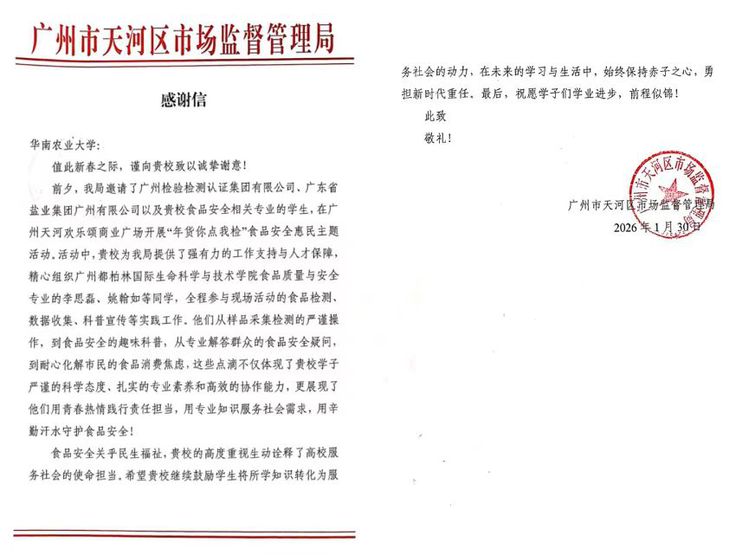 近日,广州市天河区市场监督管理局在辖内商超开展“你点我检·安心年货”活动。本次活动创新采用“政企护航+青年助力”模式,由包括我校广州都柏林国际生命科学与技术学院(简称“广州都柏林学院”)食品质量与安全专业(中外合作办学)学子在内的多名广州籍食品安全专业留学青年组成“食安智囊团”,共同传递舌尖上的民生温度。