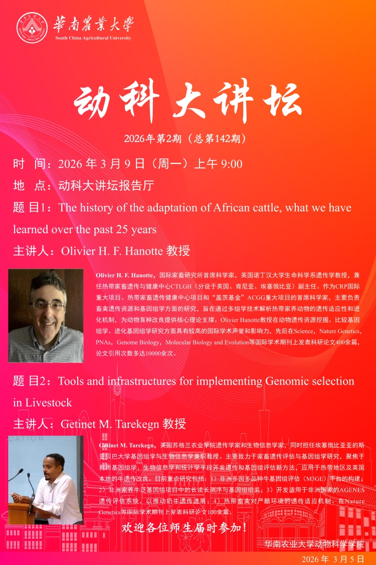 动科大讲坛(第142期):The history of the adaptation of African cattle, what we have learned over the past 25 years/Tools and infrastructures for implementing Genomic selection in Livestock