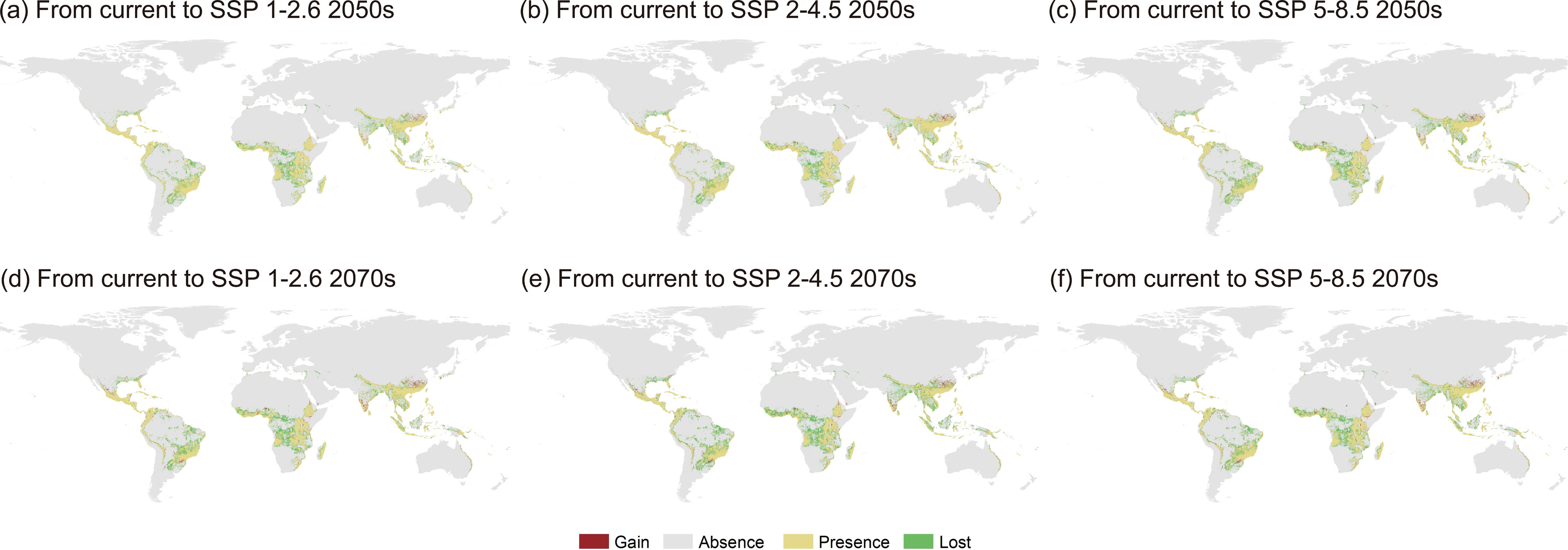 研究证实,肿柄菊(T. diversifolia)在入侵过程中整体表现出强烈的生态位保守性,仅向更干燥、更高海拔以及更高人类干扰的区域有限扩张。基于全球分布数据构建的物种分布模型,其预测准确性显著优于仅基于原产地或入侵地数据的模型,能更全面地捕捉物种的生态耐受性。未来气候情景下,肿柄菊的全球总体适宜生境面积将呈减少趋势,仅在中国南部、东南亚及中美洲等分布区边缘地带出现碎片化扩张,并向中高纬度地区移动。扩散模型模拟结果显示,即便存在较强扩散障碍,在不同扩散情景下其占据面积仍可扩张40倍以上,表明其入侵潜力主要由气候适宜性和自身扩散能力驱动,当前的实际分布远未达到饱和。